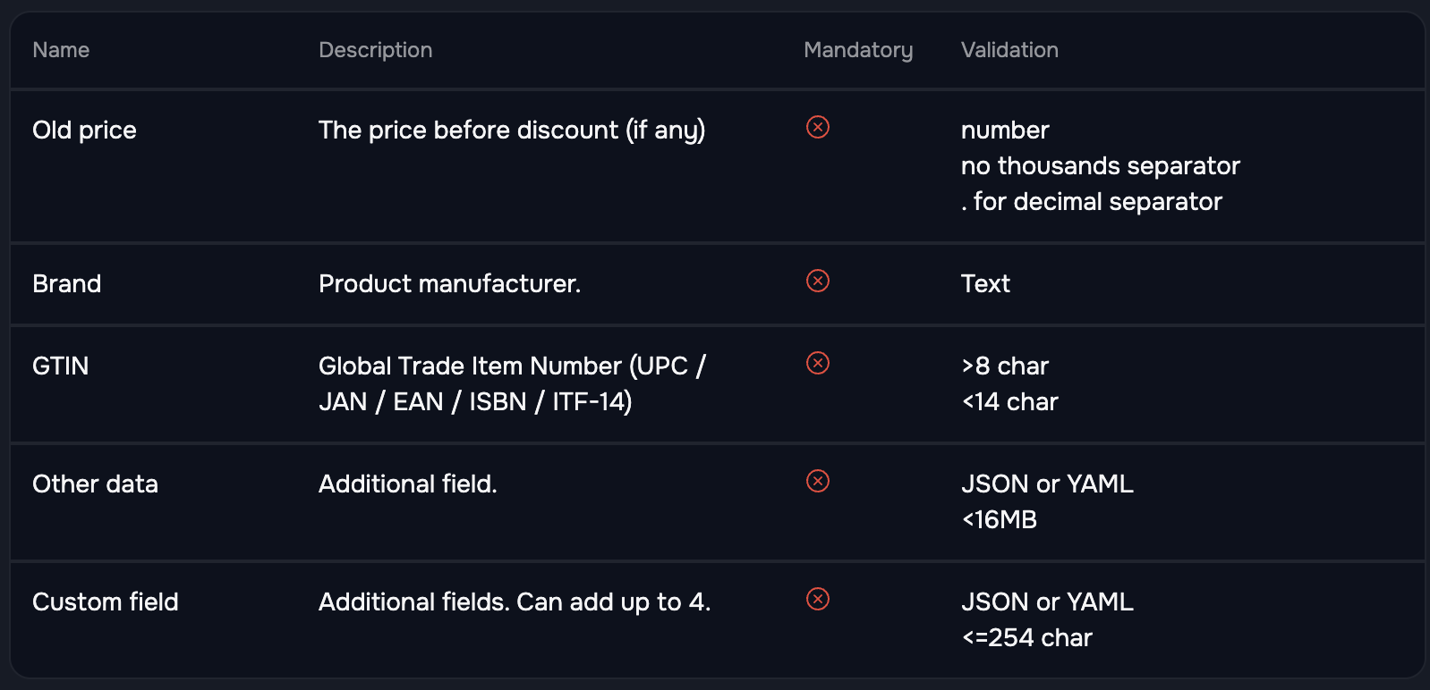Your product feed can contain as much information as you need, which you can easily map to our required and optional fields.